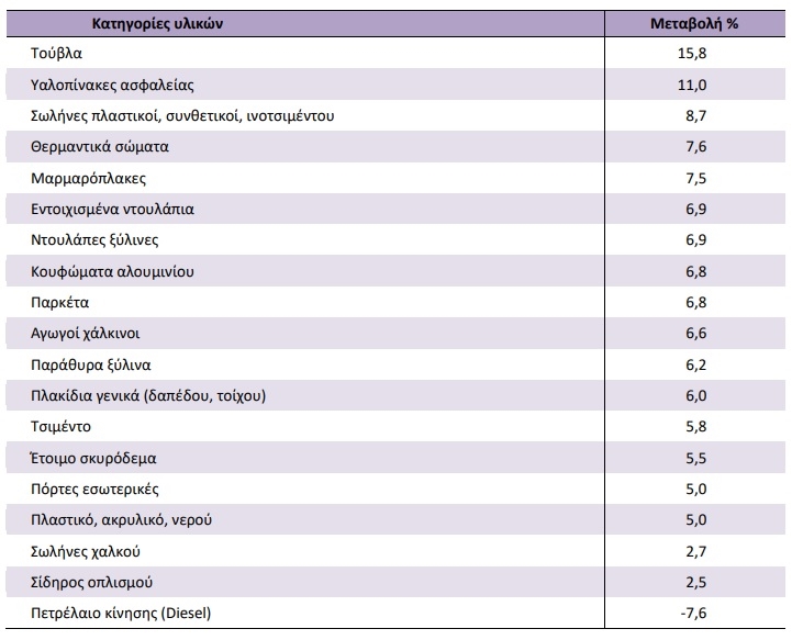 Aύξηση 5,6% σημειώθηκε στις τιμές υλικών κατασκευής νέων κατοικιών τον Ιανουάριο, σύμφωνα με τα στοιχεία που δημοσίευσε η Ελληνική Στατιστική Αρχή.