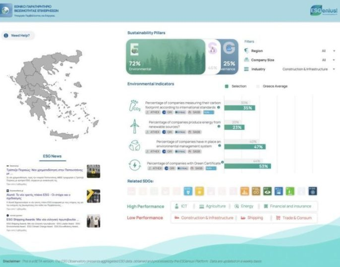 Ενεργοποιείται το Εθνικό Παρατηρητήριο Βιωσιμότητας Επιχειρήσεων του Υπουργείου Περιβάλλοντος και Ενέργειας, το οποίο θα υποστηριχθεί από τον ΟΦΥΠΕΚΑ παρέχοντας υπηρεσίες καθοδήγησης και helpdesk στις Ελληνικές Εταιρείες που θα υποβάλουν τα δεδομένα τους και αποτελεί ένα ενιαίο εθελοντικό πληροφοριακό σύστημα συλλογής, επεξεργασίας και παρουσίασης της απόδοσης των ελληνικών επιχειρήσεων σε ζητήματα Βιωσιμότητας και ESG. Όπως αναφέρεται σε σχετική ανακοίνωση, αποτελεί μια πρωτοβουλία του ΥΠΕΝ προς την ευαισθητοποίηση και ενσωμάτωση βέλτιστων πρακτικών εκ μέρους των Ελληνικών Επιχειρήσεων, ανεξαρτήτως μεγέθους και οικονομικής δραστηριότητας, σε θέματα Περιβαλλοντικής, Κοινωνικής και Εταιρικής Διακυβέρνησης.