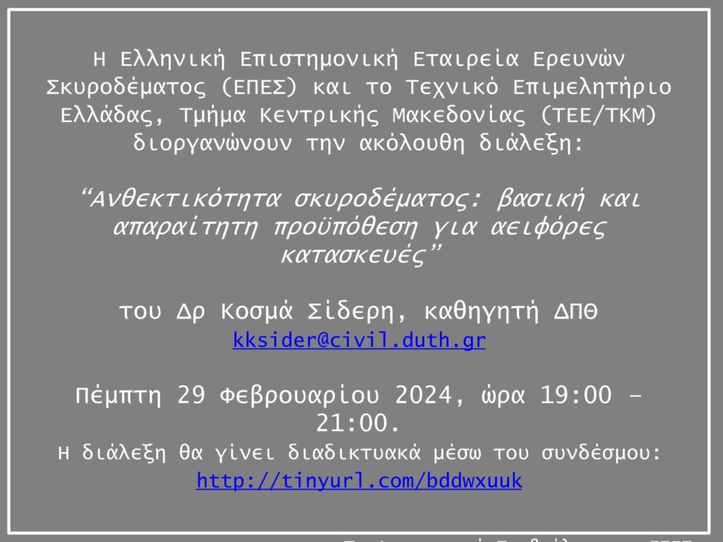 Στο πλαίσιο αυτό, την Πέμπτη 29 Φεβρουαρίου 2024, ώρα 19:00 συνδιοργανώνεται διάλεξη με θέμα : «Ανθεκτικότητα σκυροδέματος: βασική και απαραίτητη προϋπόθεση για αειφόρες κατασκευές».