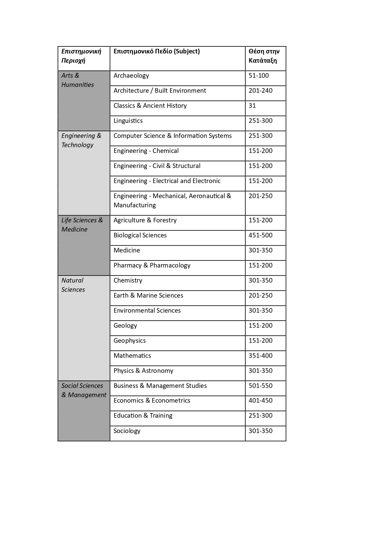 Σε 15 επιστημονικά πεδία κατατάσσεται στις πρώτες 300 θέσεις παγκοσμίως και είναι πρώτο μεταξύ των ελληνικών πανεπιστημίων. Σε σύγκριση με το 2023 σημειώθηκε άνοδος σε 9 επιστημονικά πεδία.