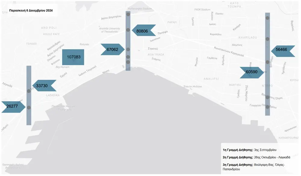 - Ανάλυση κυκλοφοριακών φόρτων που συλλέγονται μέσω του εξοπλισμού ανίχνευσης κυκλοφορίας του Ολοκληρωμένου Συστήματος Διαχείρισης Κυκλοφορίας της Περιφέρειας Κεντρικής Μακεδονίας (ΠΚΜ) σε τρεις γραμμές διήθησης screen lines